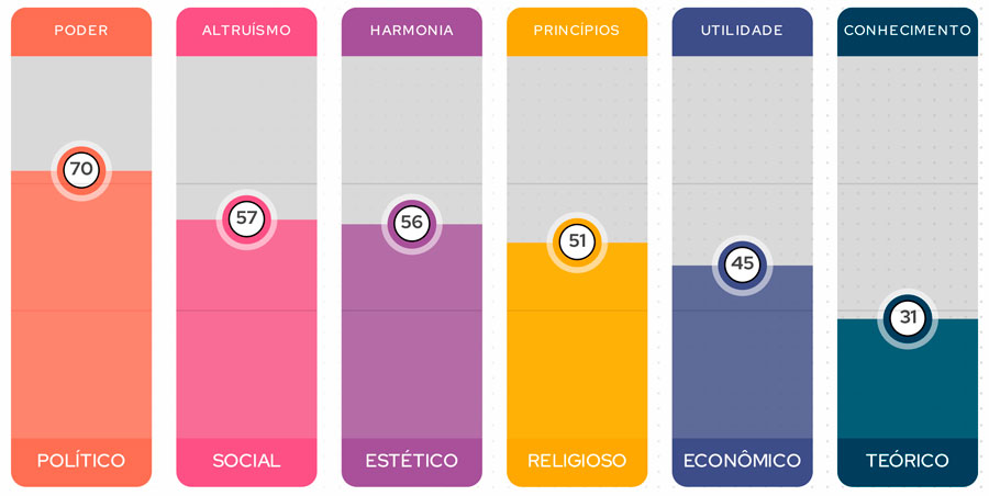 O CIS Assessment identifica a força atual de seis valores básicos que impulsionam nossas ações: Teórico (busca por conhecimento), Econômico (foco em utilidade), Estético (valorização da harmonia), Social (altruísmo), Político (desejo de poder) e Religioso (princípios). Com isso, você entende o que realmente motiva você e aqueles ao seu redor!