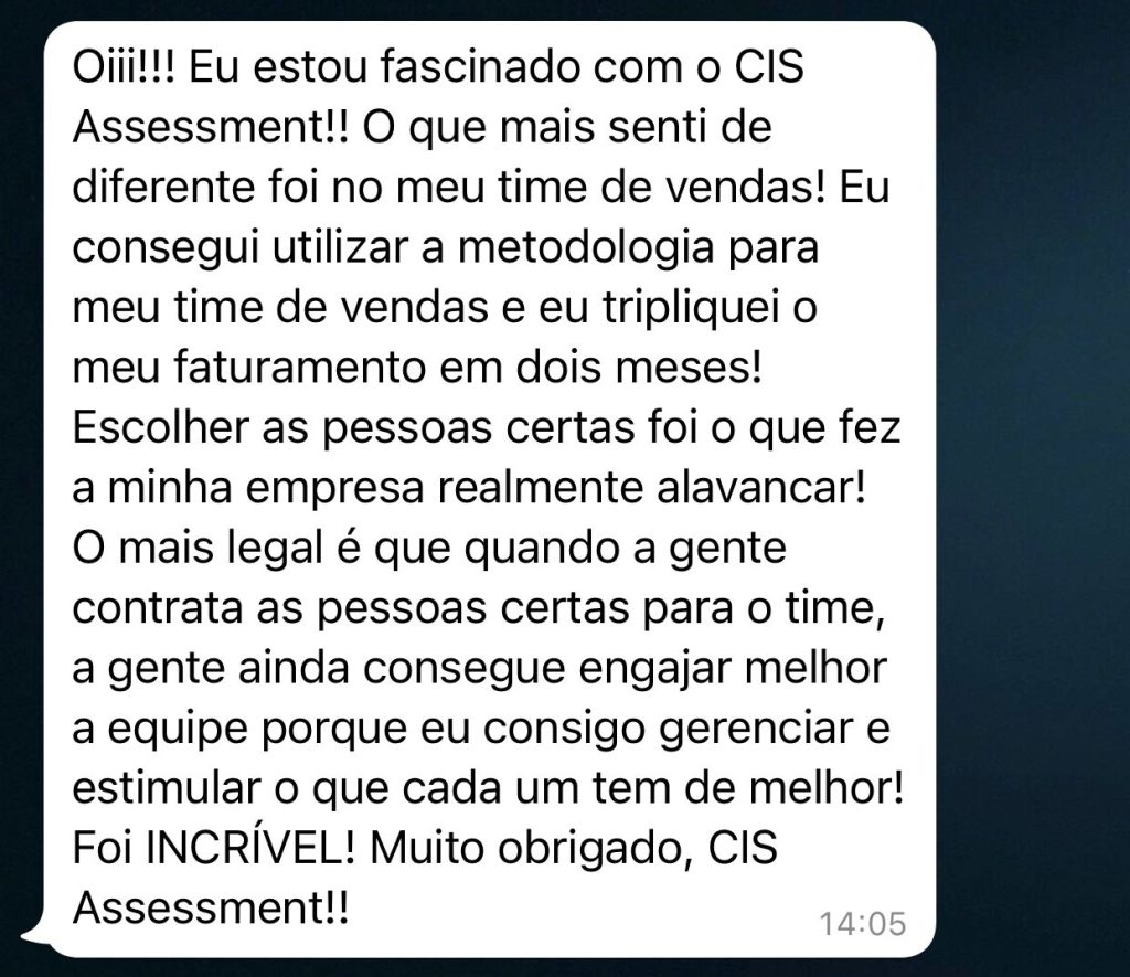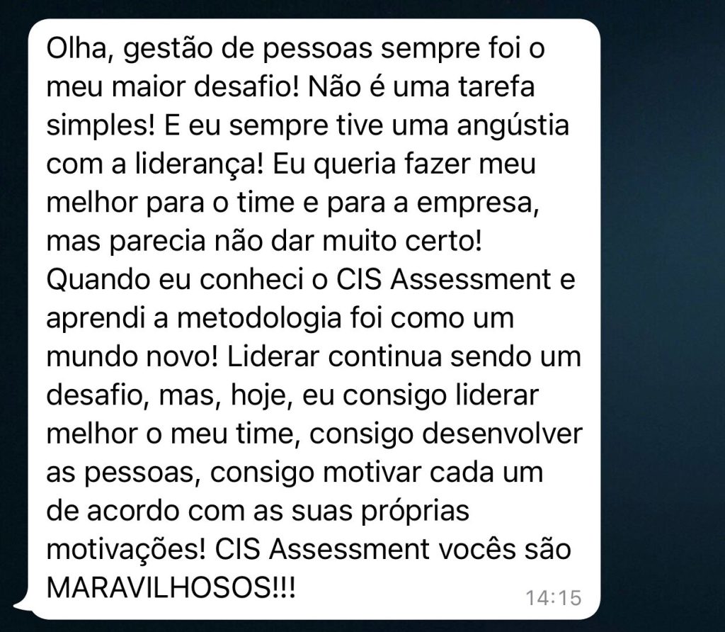 “Ao longo da minha trajetória, já ajudei líderes, gestores e empresários a potencializar os resultados das suas empresas através da metodologia de Análise de Perfil Comportamental do CIS Assessment.