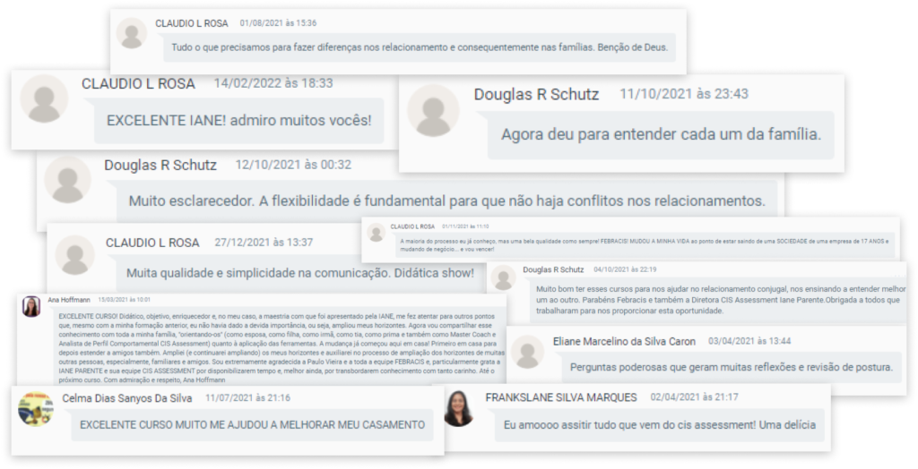 Olá, me chamo Iane Parente ao longo da minha trajetória como Master Trainer e Analista de Perfil Comportamental, já ajudei várias pessoas a aplicarem a Análise de Perfil comportamental até chegar o momento onde quis passar esse conhecimento adiante e ajudar e ajudar casais a melhorarem suas relações.